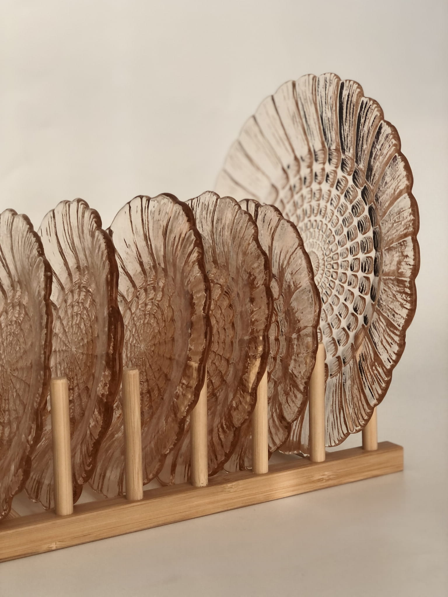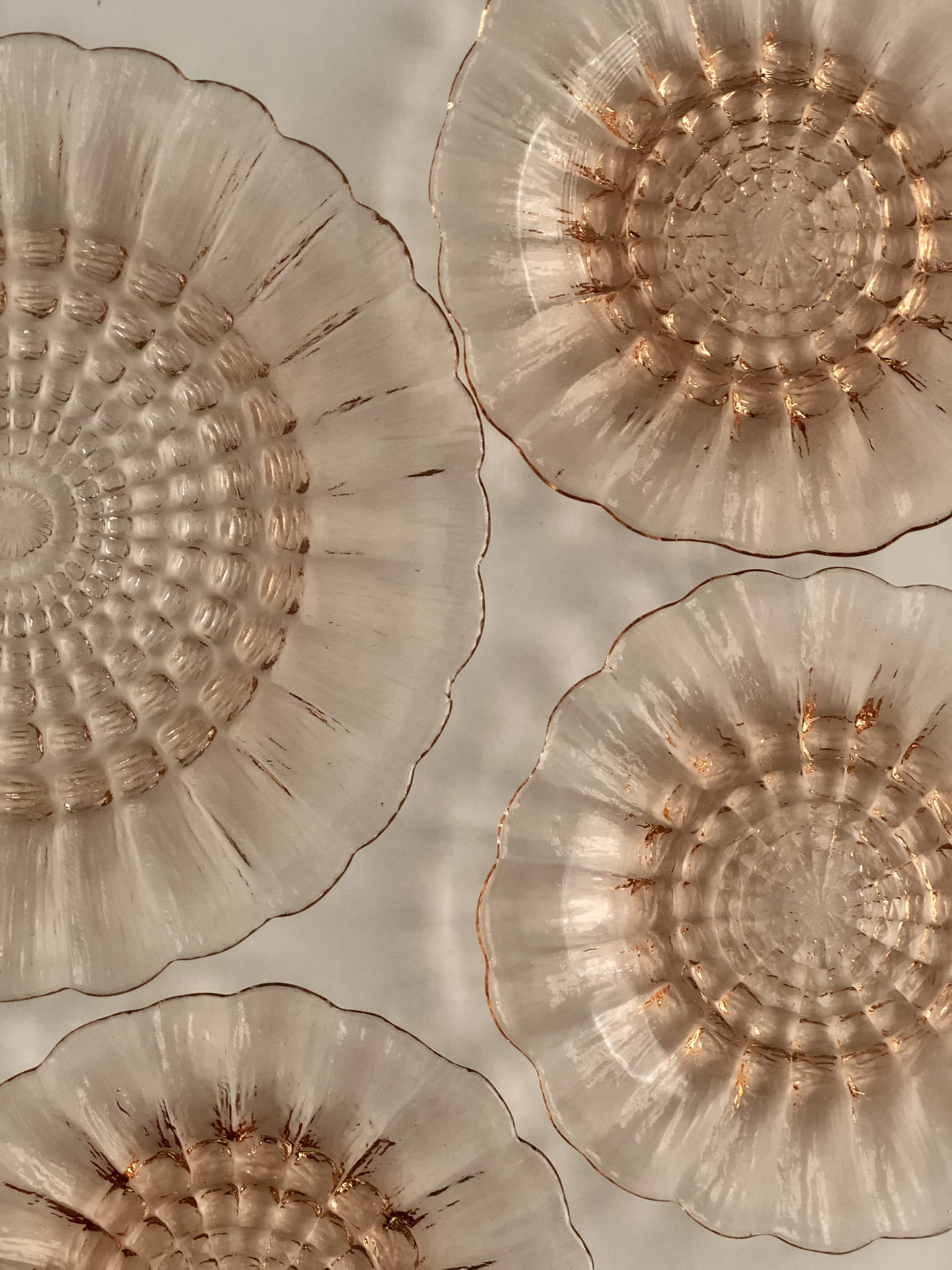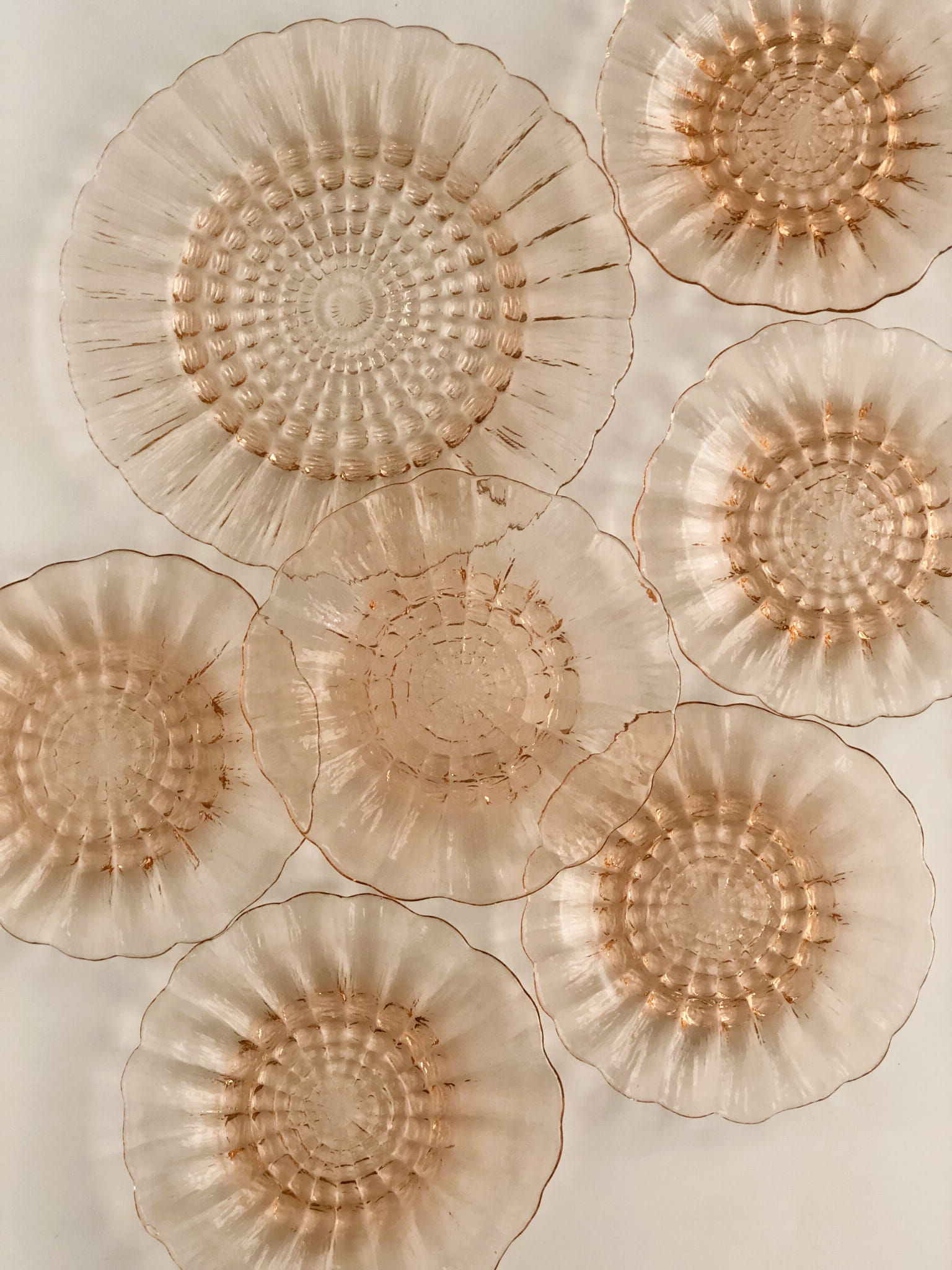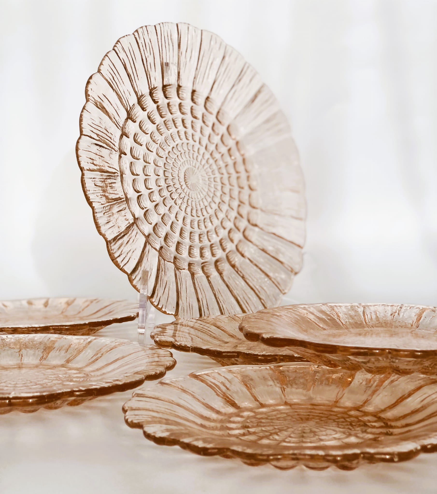 Przepiękny zestaw deserowy „Cora” patera i 6 talerzyków, Huta Ząbkowice. Kolor rozalinowy.