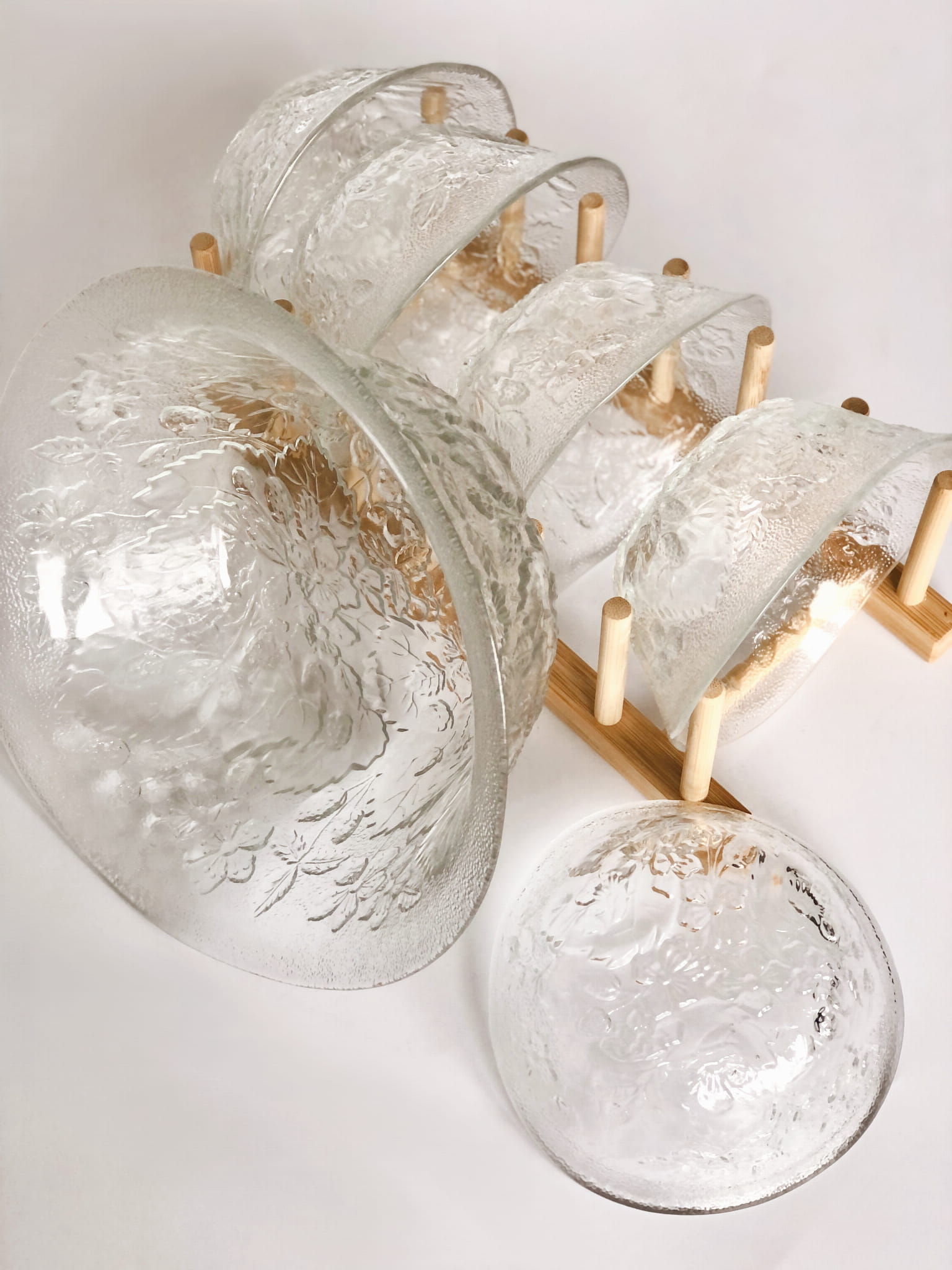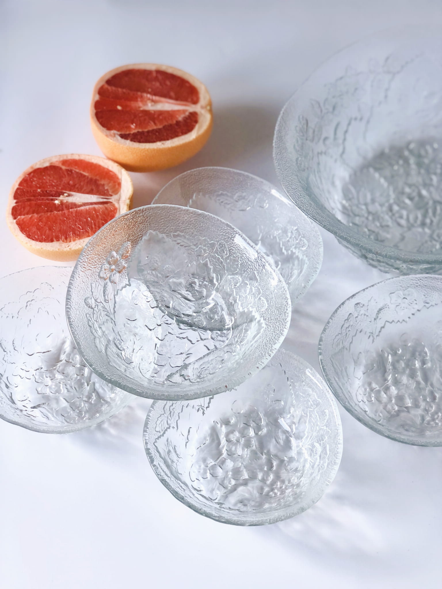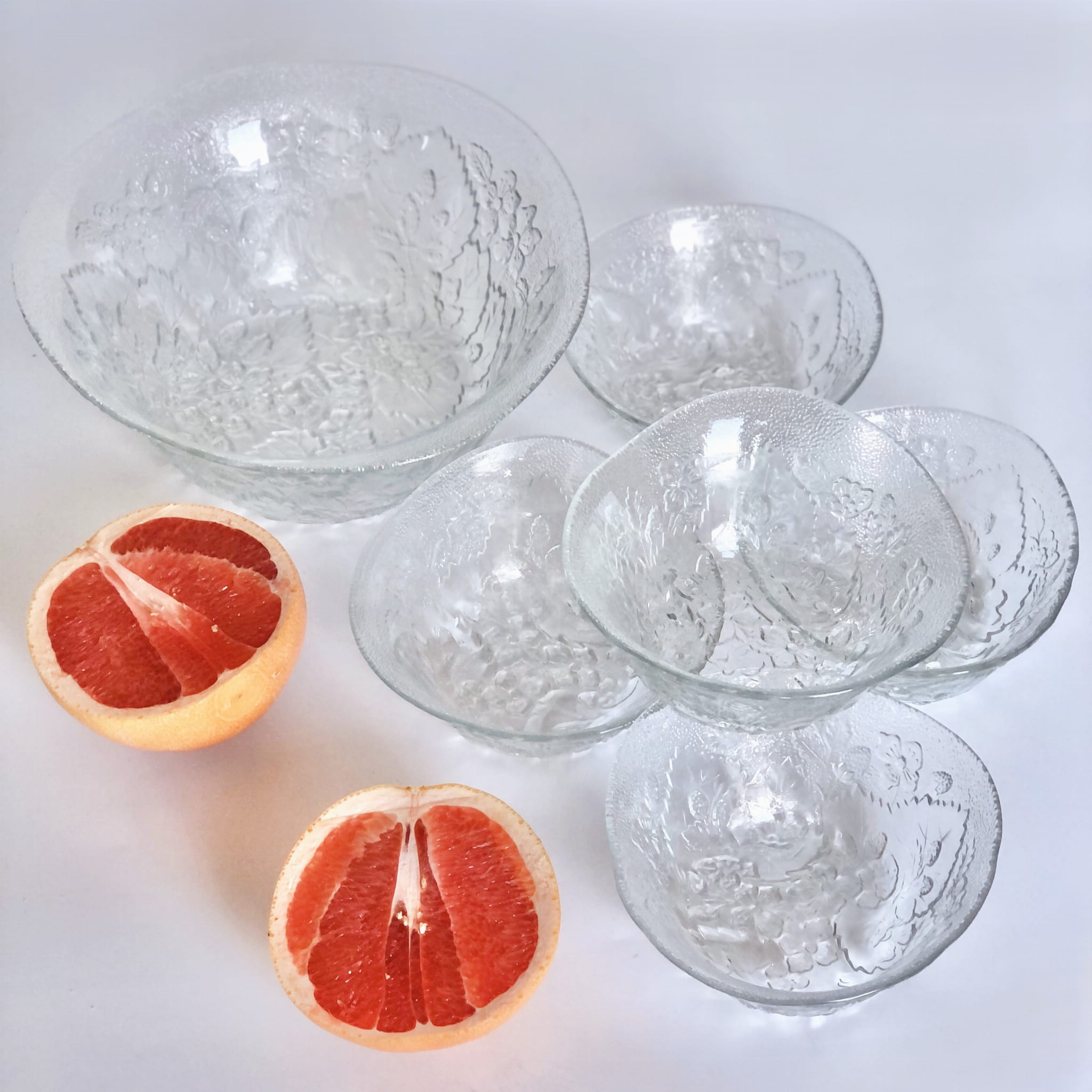 Zestaw zawiera misę oraz 5 sztuk miseczek, szkło transparentne, w piękne florystyczne zdobienia. Forma nieregularna.