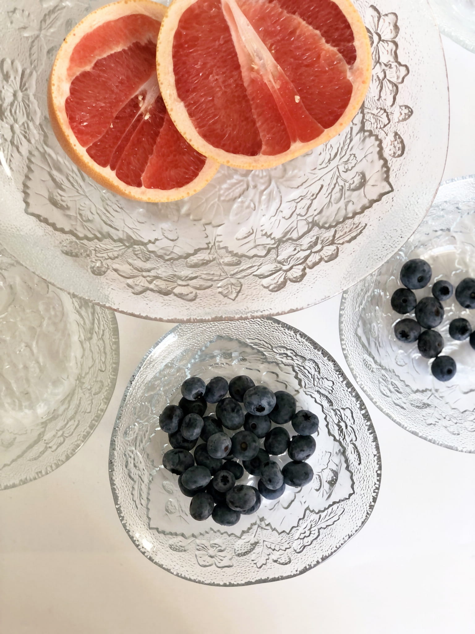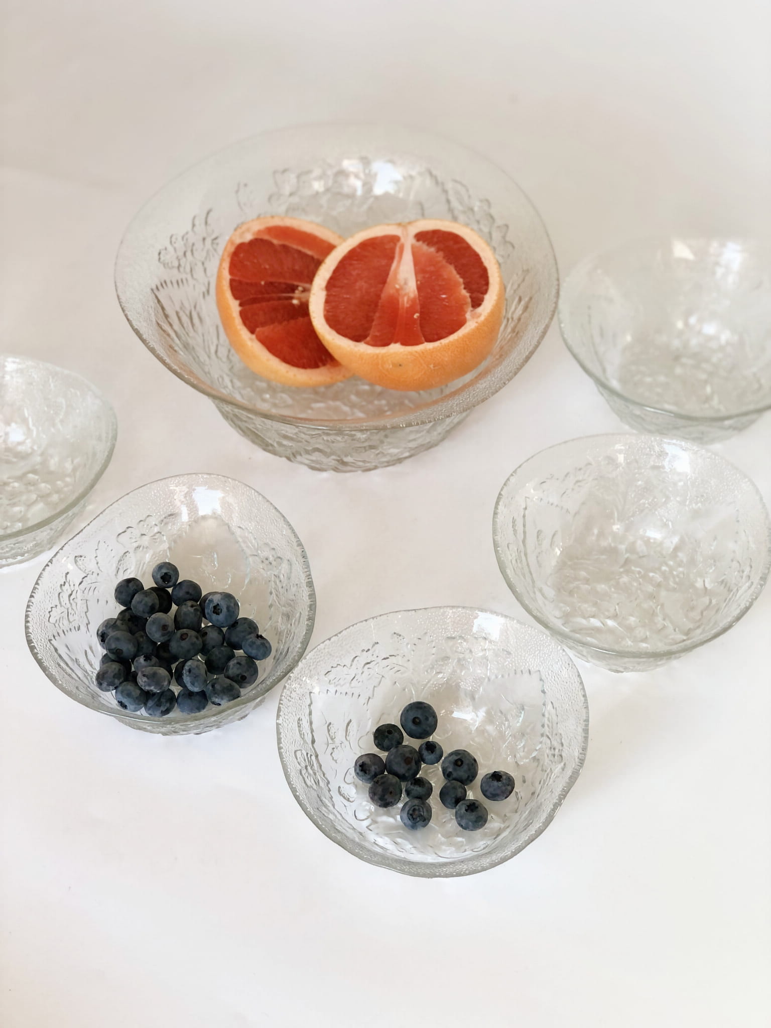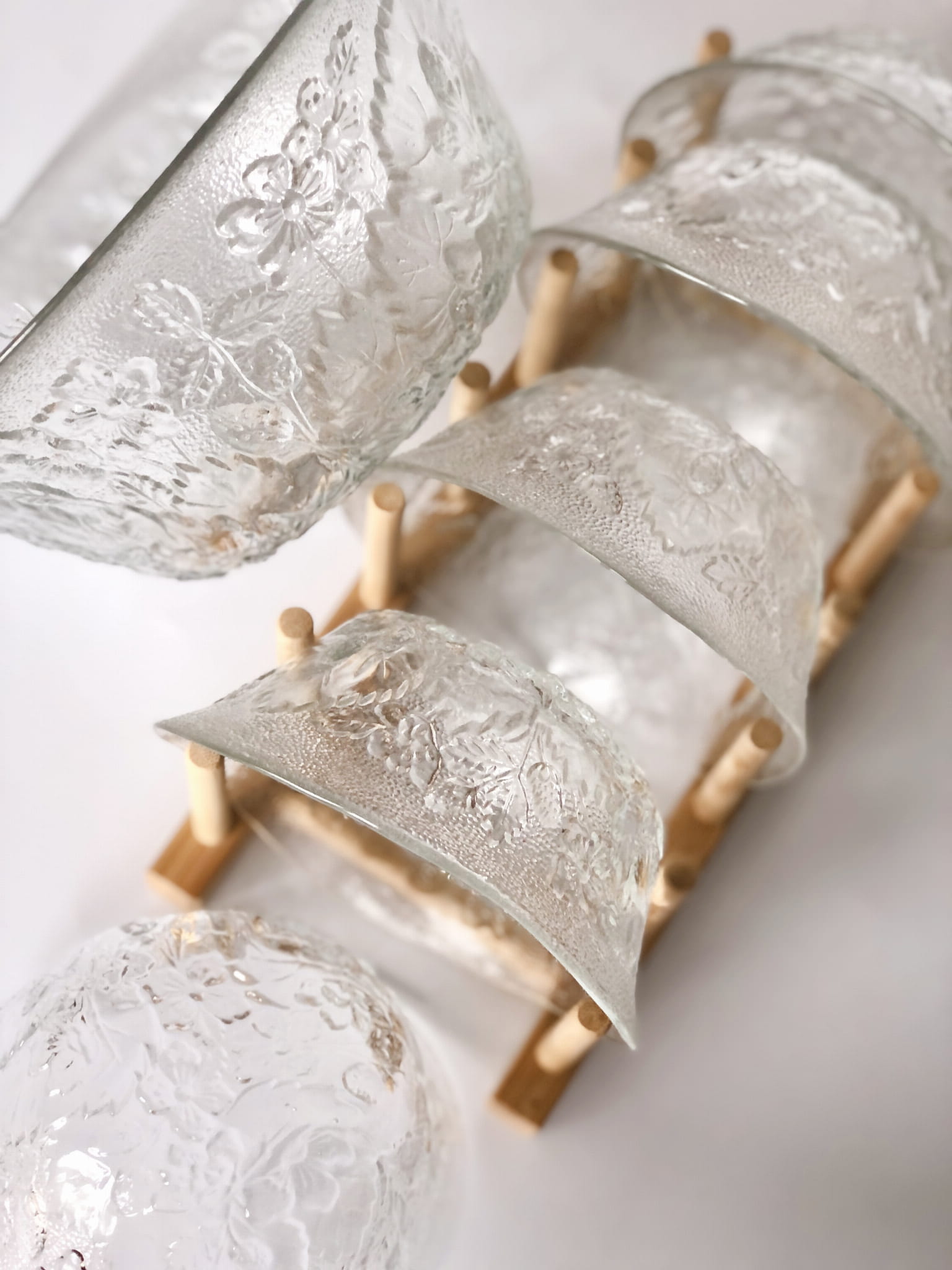 Zestaw zawiera misę oraz 5 sztuk miseczek, szkło transparentne, w piękne florystyczne zdobienia. Forma nieregularna.