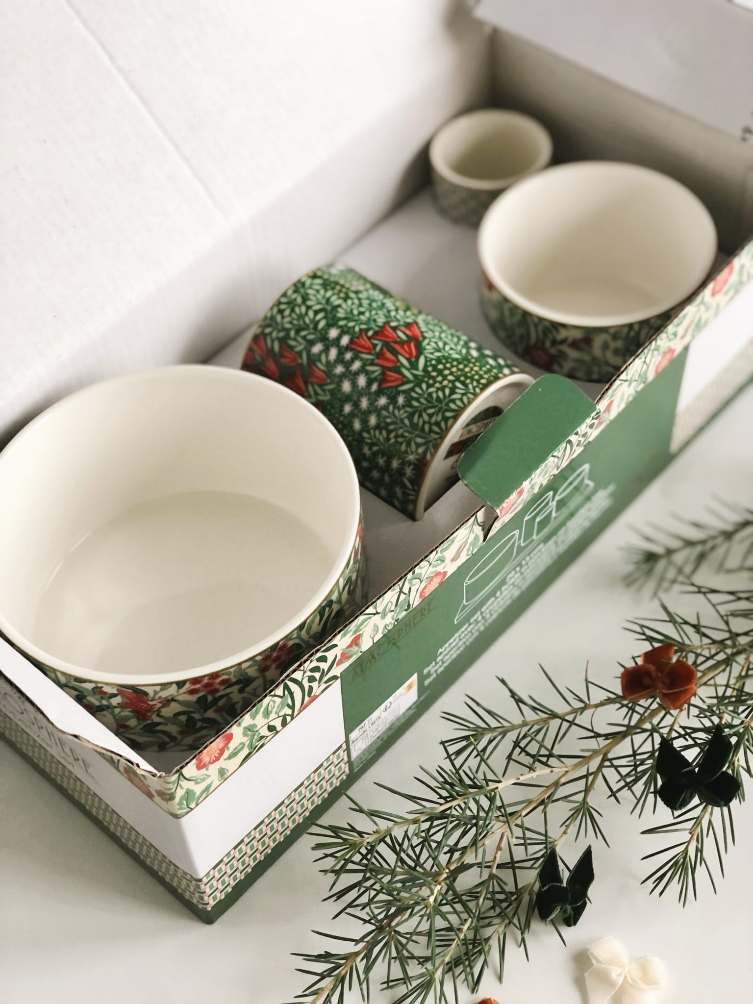 Zestaw czterech porcelanowych miseczek został ozdobiony unikalnym motywem kwiatowym dodającym świeżości i fantazji podczas codziennych posiłków.