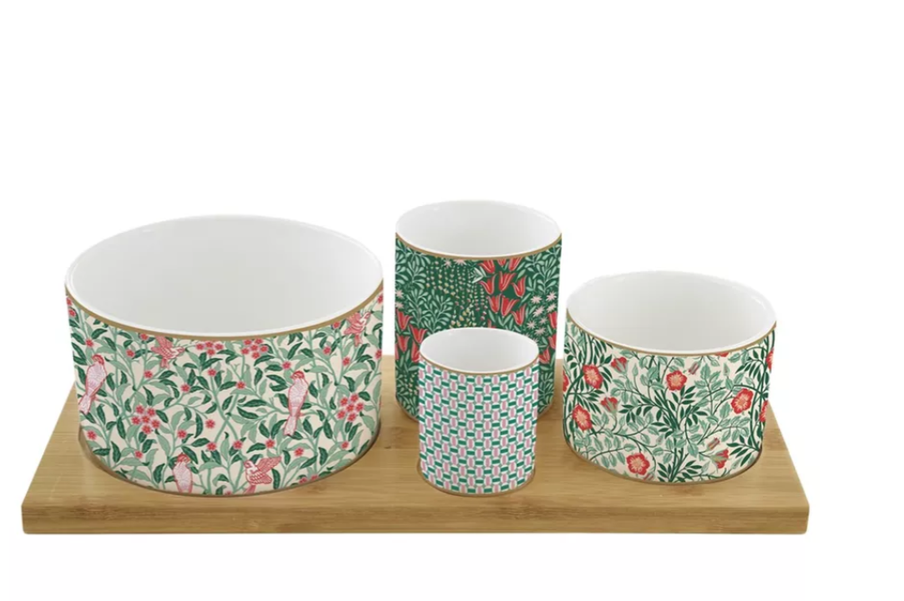 Zestaw czterech porcelanowych miseczek do przystawek 29×13 na bambusowej tacy.