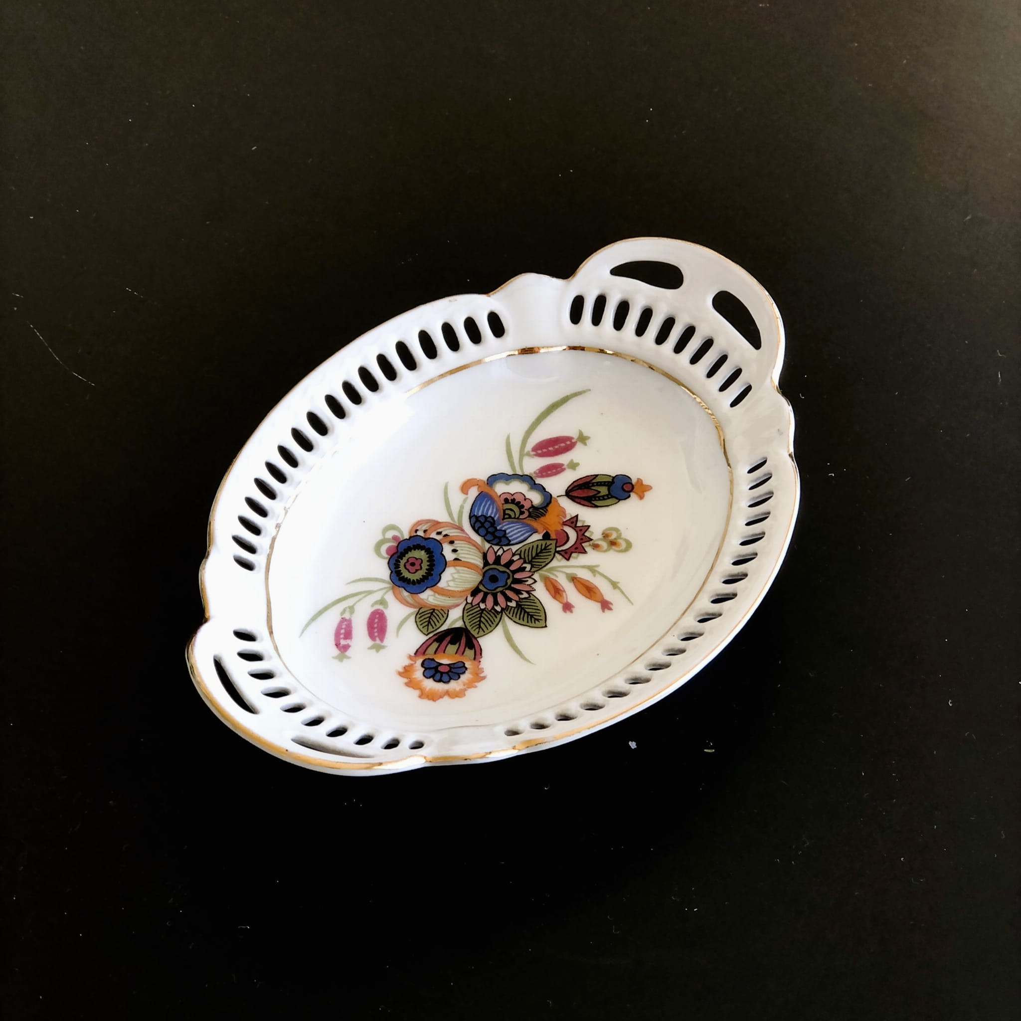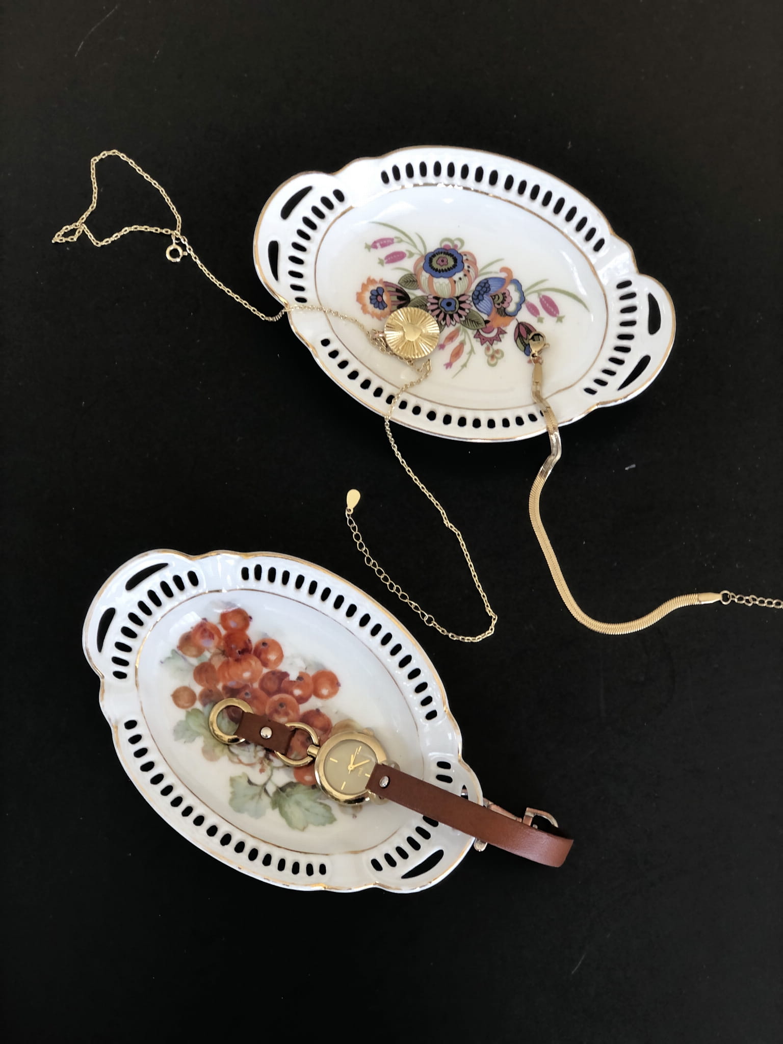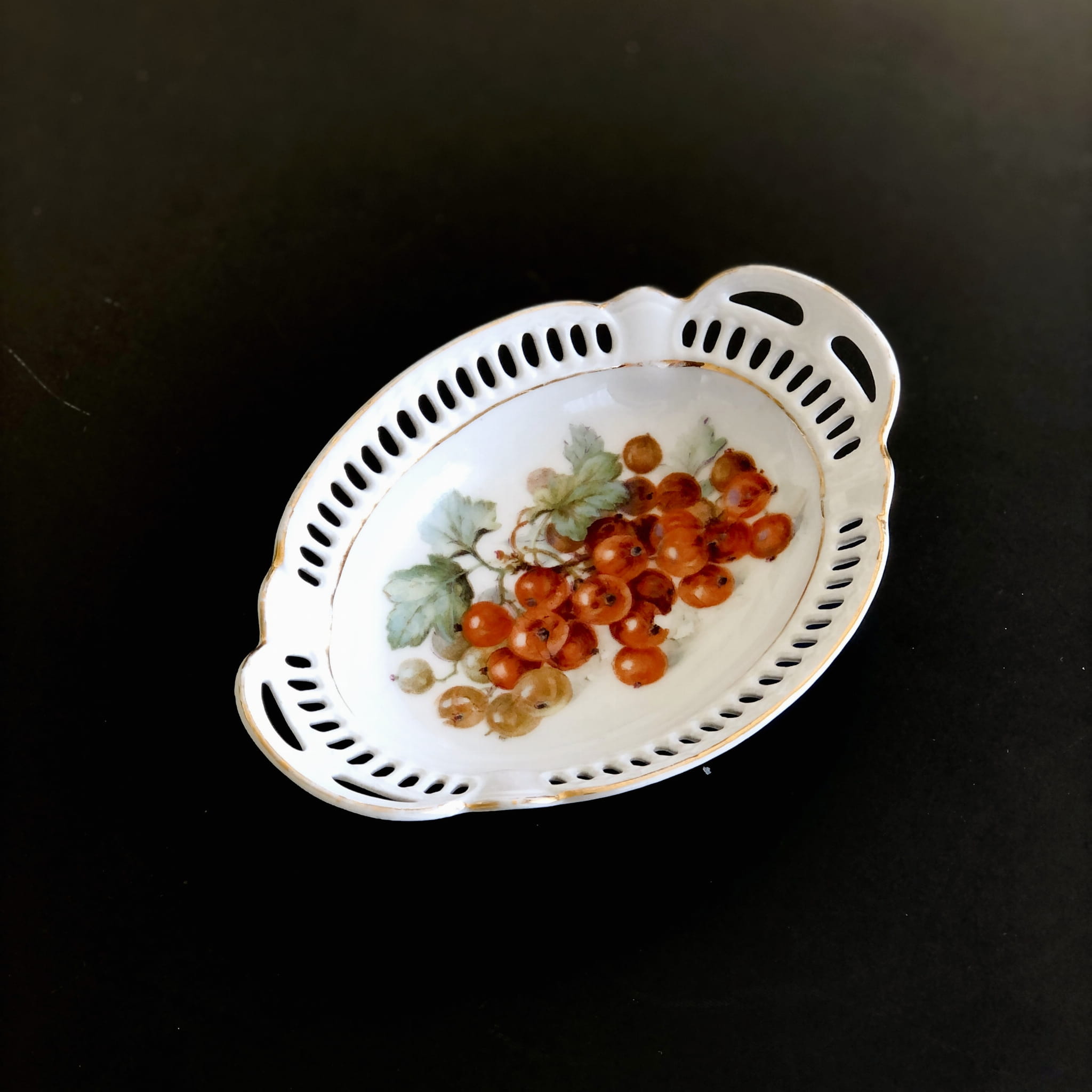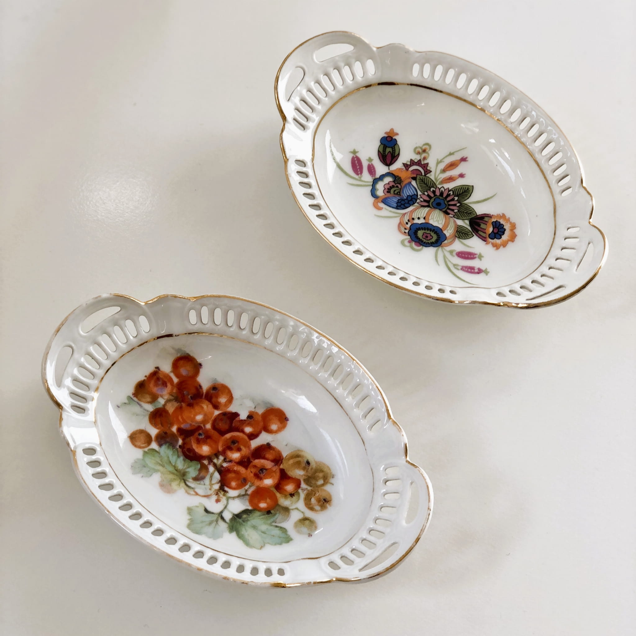 Dwie małe miseczki wykonane z białej porcelany, ozdobione ażurowym brzegiem, dekorowane złoceniami oraz kolorowymi nadrukami gałązki porzeczek oraz wzorami kwiatowymi.