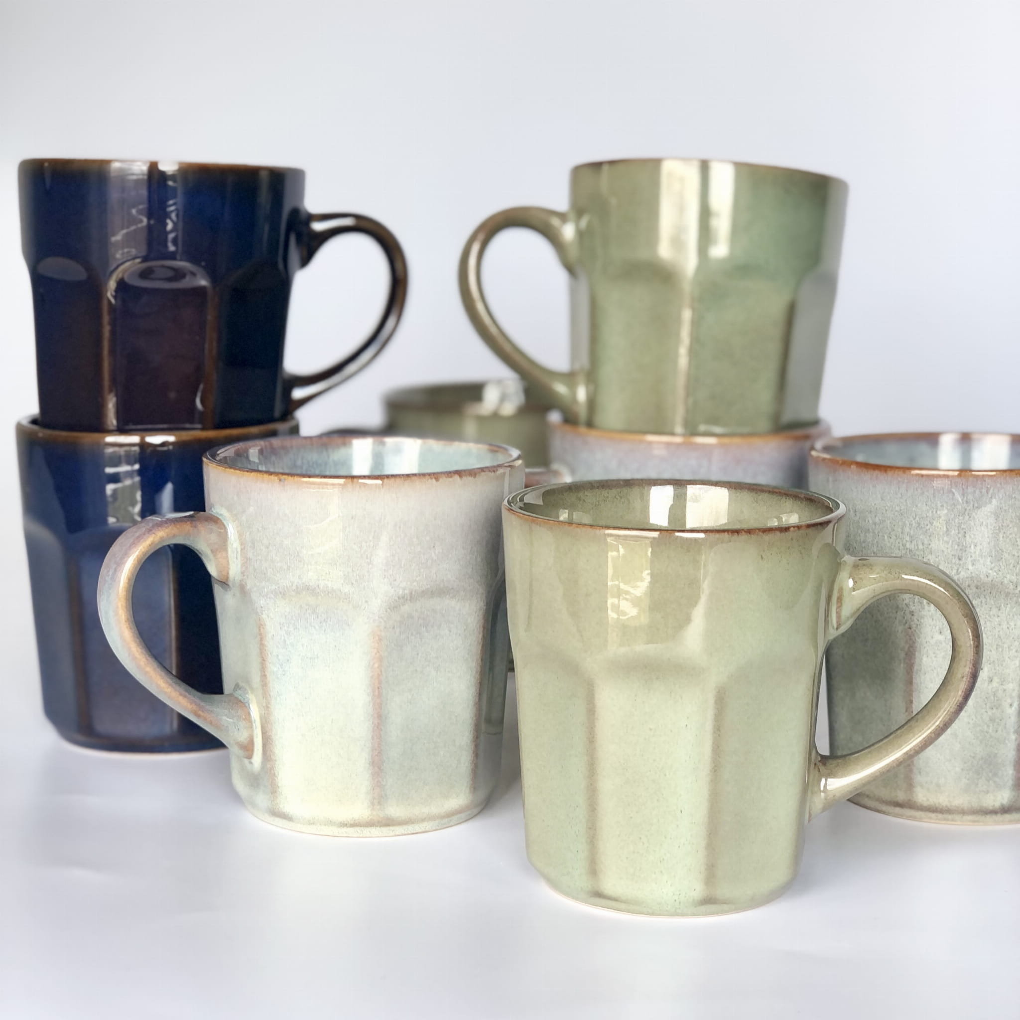 Duże kubki w stylu vintage posiadają delikatny połysk, zostały poddane iryzowaniu, czyli metodzie zdobienia ceramiki polegającej na wytworzeniu na jej powierzchni cienkiej przezroczystej warstewki mieniącej się barwami tęczy.