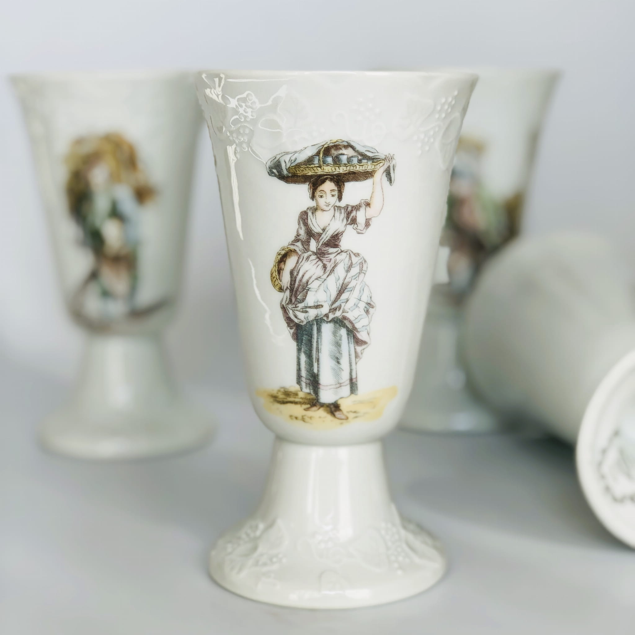 Stare, francuskie kielichy z grafikami postaci i dawnych zawodów.